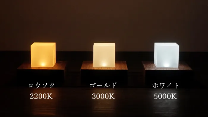 光の色は2200K(ロウソク)、3000K(ゴールド)、5000K(ホワイト)の3種類。