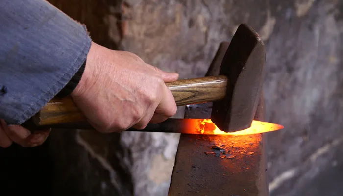 職人さんが熱くした鉄を叩いていますね。